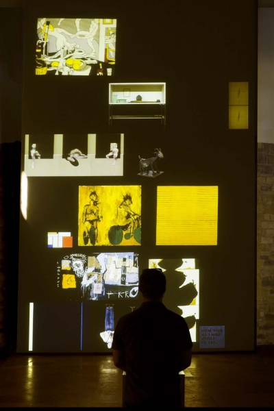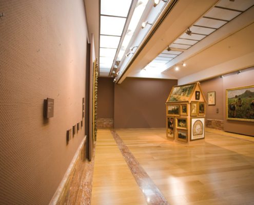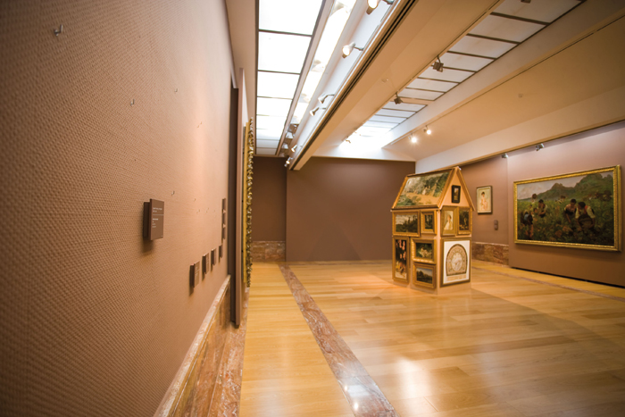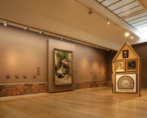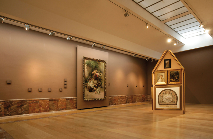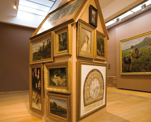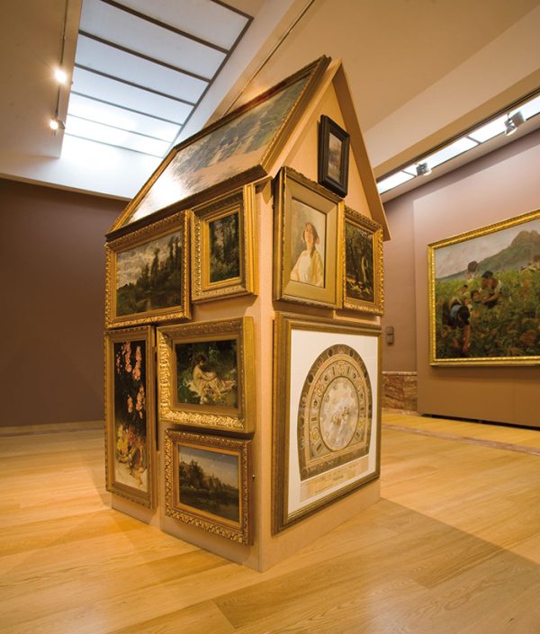 Estamos en la sala VIII del Museo de Bellas Artes de Murcia, sala dedicada a las Alegorías, pintura decorativa y paisaje. No podría ser un lugar más idóneo: la sensibilidad burguesa decimonónica gustaba de adornar sus hogares con cuadros decorativos en un estilo modernista que causaba sensación en París y que se puso rápidamente de moda en toda Europa. Este afán decorativo, el simple motivo de tener cuadros en casa como un status de la nueva sociedad burguesa, cobra aquí una segunda dimensión y otro significado bajo la dirección de Ampudia. Estos cuadros adosados a la barraca se vuelven anónimos en su autoría, dado que ya no les acompaña la cartela que los identifica y no sabemos cuál es de quién, salvo alguno con firma legible. Paisajes, retratos, bodegones, floreros, efebos y escenas costumbristas se mezclan unos con otros en alegre apiñamiento temporal, forrando la casita típica murciana, otra alegoría, una más de las provocadas por el artista en su despliegue por el MUBAM. Y en ningún momento se pierde el respeto por lo expuesto habitualmente en esta sala VIII del museo, este “forrar la barraca de cuadros” no degrada a las obras trasladadas temporalmente, ni en su calidad, autoría, ni modo de exposición. Las cartelas y clavos, los espacios vacíos de los cuadros en la pared, iluminados como si estuvieran en su lugar, conforman una pieza en sí que acompaña a la barraca.